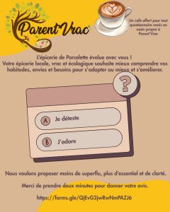 Votre épicerie locale, vrac et écologique souhaite mieux comprendre vos habitudes, envies et besoins pour s’adapter au mieux et s’améliorer. Nous voulons proposer moins de superflu, plus d’essentiel et de clarté.